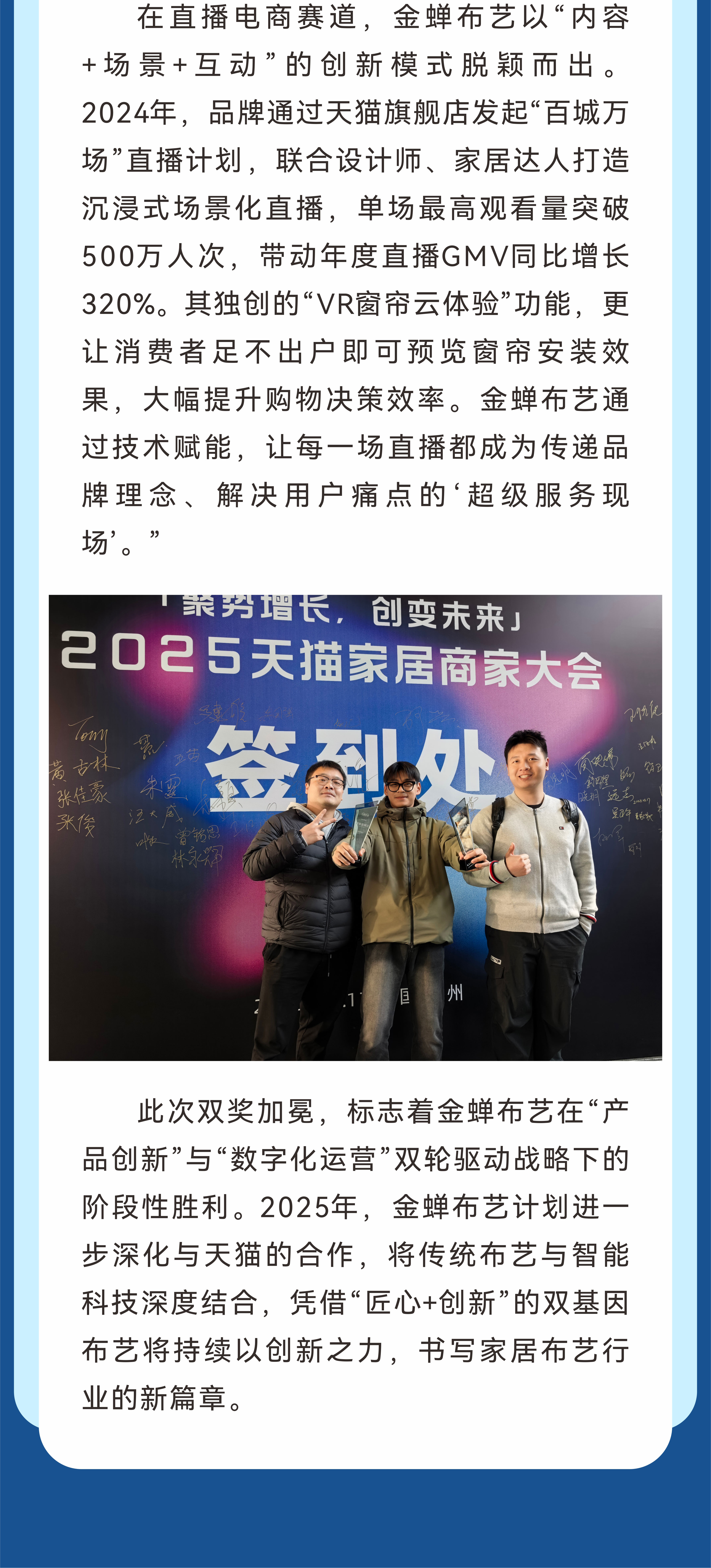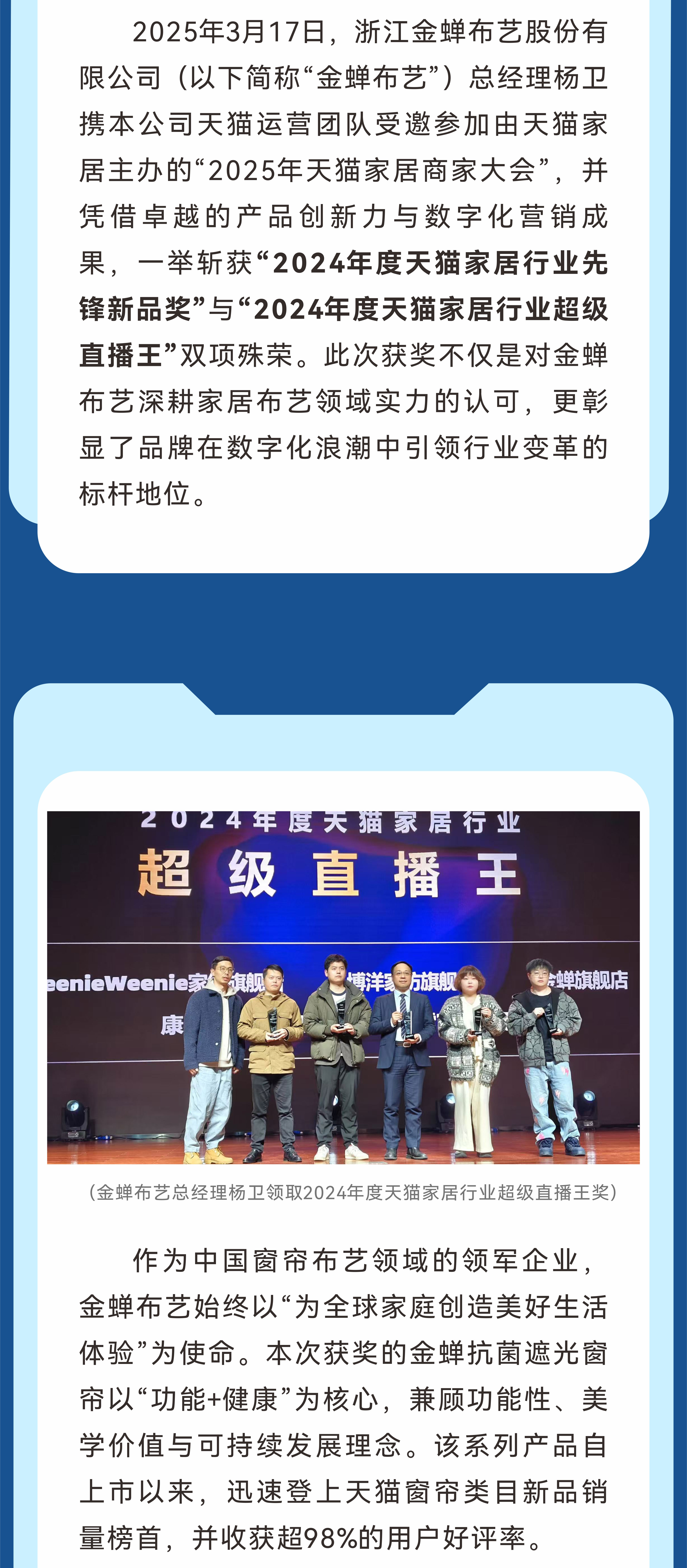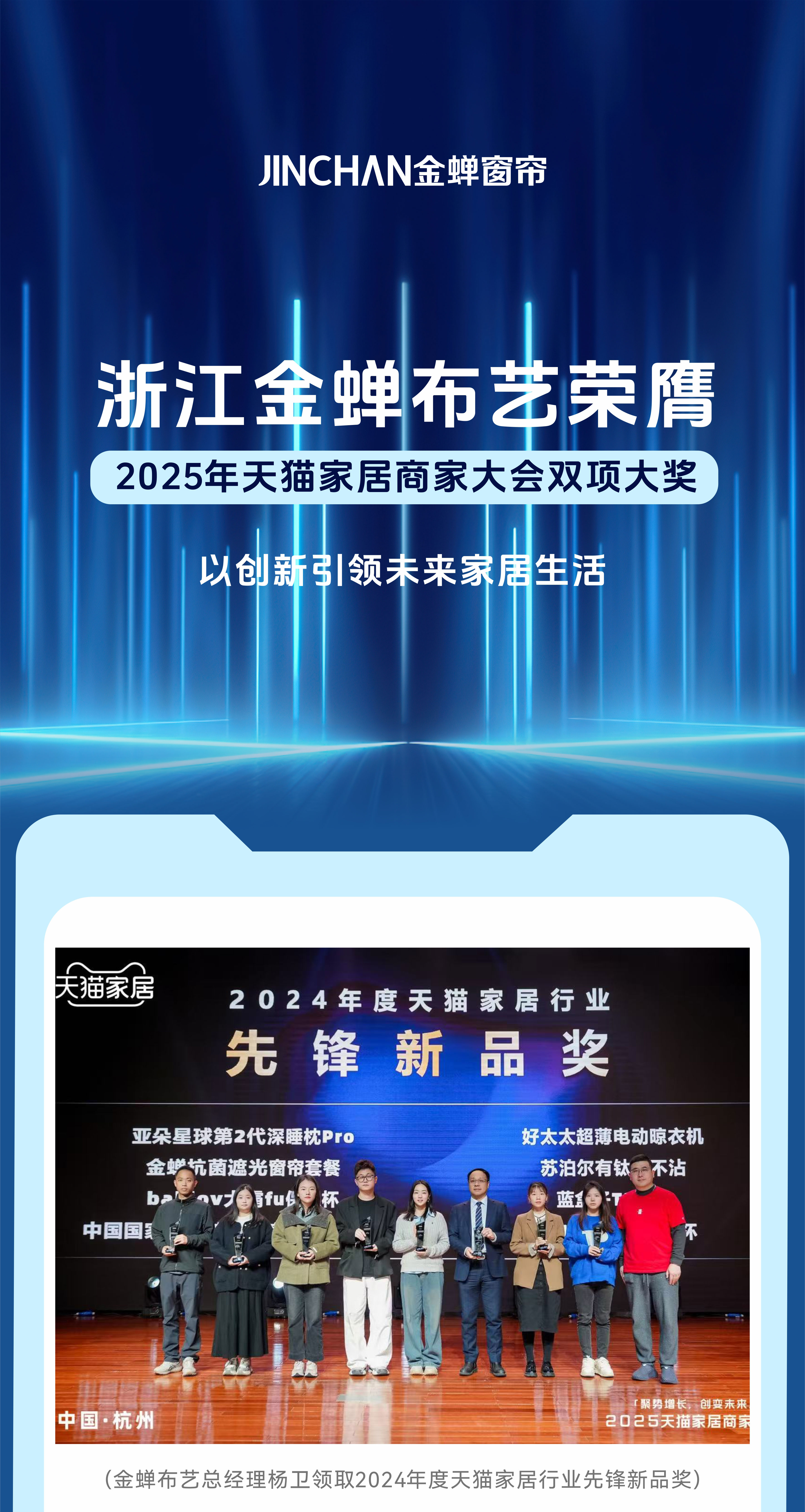 - 【JINCHAN金蟬窗簾】浙江金蟬布藝榮膺2025年天貓家居商家大會雙項大獎:以創(chuàng)新引領未來家居生活? 2025-03-18